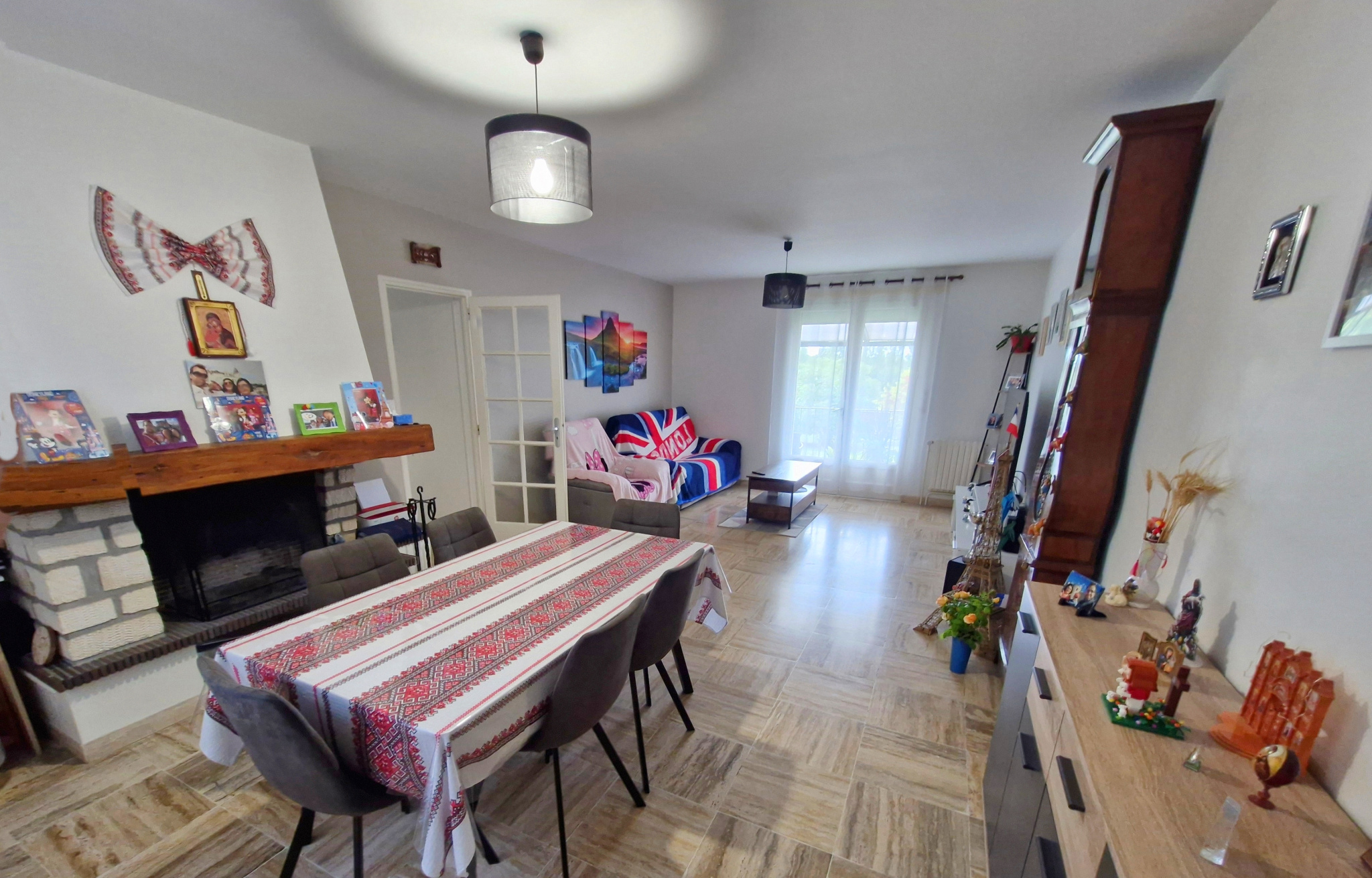 SORTIE DE CHATELLERAULT Secteur OUEST -- MAISON comprenant au rez-de-chaussée : entrée avec placard - séjour double 30m² avec cheminée - cuisine aménagée - dégagement - 3 chambres - salle de bains - wc -- A l'étage : dégagement - 3 chambres (dont une transformée en dressing) - salle d'eau - wc -- Chauffage central GAZ et cheminée bois -- Huisseries double vitrage --- Grand sous-sol de 66m² avec un GARAGE de 27m² -- Autre GARAGE de 25m² -- Grande terrasse couverte (pergola) -- L'ensemble sur un TERRAIN clos et arboré de 2085m².